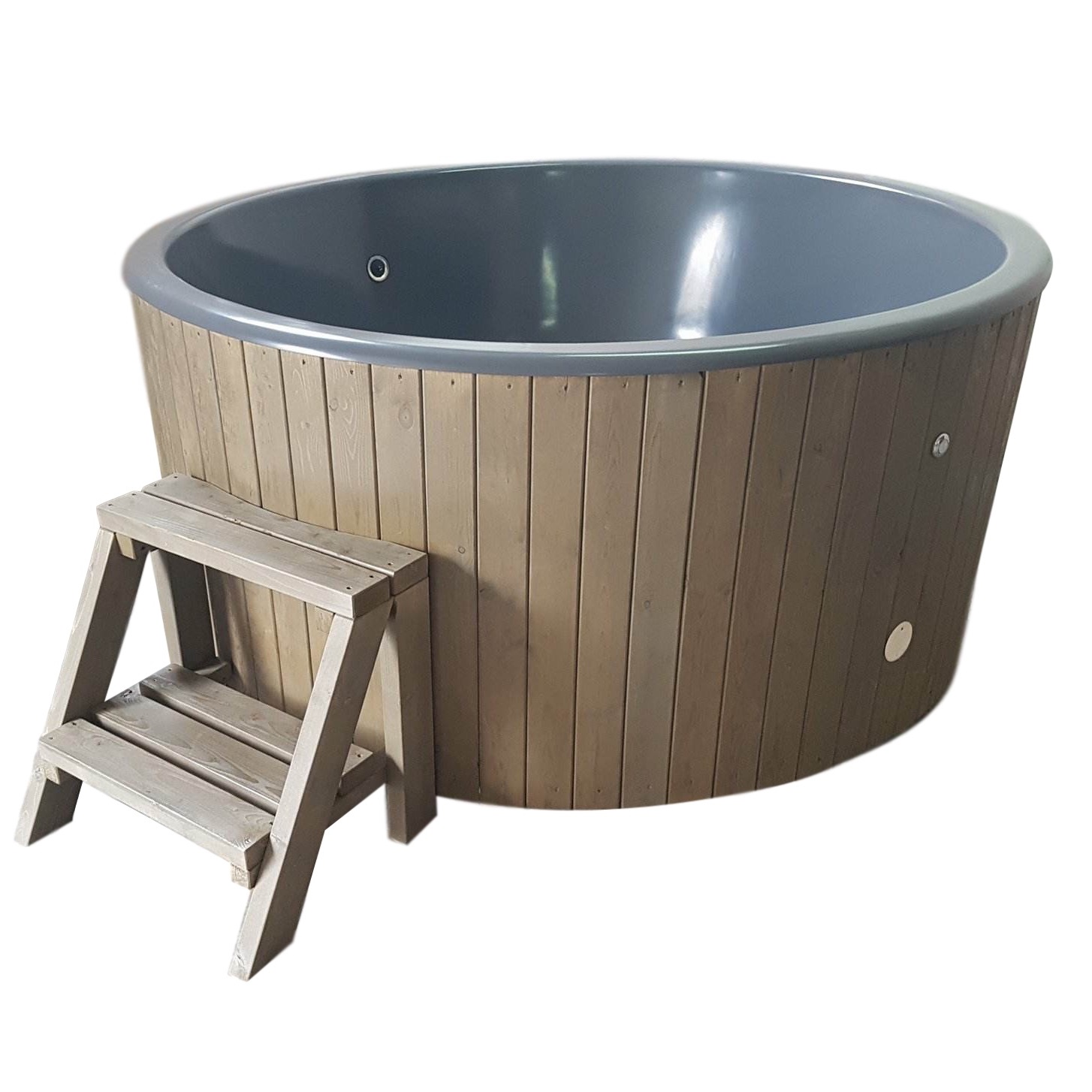 Außendurchmesser: 200 cm, Innendurchmesser: 180 cm, Leergewicht: 160 kg, Wasserkapazität: ca. 850-1000 Liter, Aufheizzeit: ca. 2,5 – 3,5 Stunden, Innenschale aus massivem GFK, Innenschale erhältlich in: blau, grau oder creme.